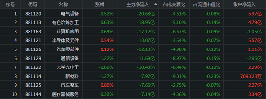 主力资金流出的板块分别是电气设备、有色冶炼、计算机应用,主力资金流出金额分别为20.68亿元、18.95亿元、17.12亿元,其中散户净流入金额为5.37亿元、4.79亿元、-1.05亿元。