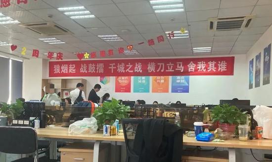 在美团优选长沙办公室里,三张红字横幅悬挂在头顶,气势汹汹地写着“冲冲冲”“多拜访”“美团铁军必胜”。