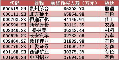 在个股方面,融资客顶住短线可能回调的压力持续吸纳有色股,4只标的名列前十,其中北方稀土周内创出近2个半月新高,被融资净买入6.6亿元居于第2位。不过,融资客最爱的还是“老相好”股王贵州茅台,虽然有原总经理助理张城犯受贿罪被判13年的消息,但仍被融资净买入8.6亿元居首。