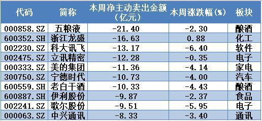 在净主动卖出方面,一些走出长牛架势的消费股意外上榜。其中,五粮液被净主动卖出21亿元居首,另一只二线白酒股老白干酒也被净主动卖出10亿元。此外,美的集团、伊利股份这些消费大牛也赫然上榜,一些行业龙头白马股也遭到净主动卖出。