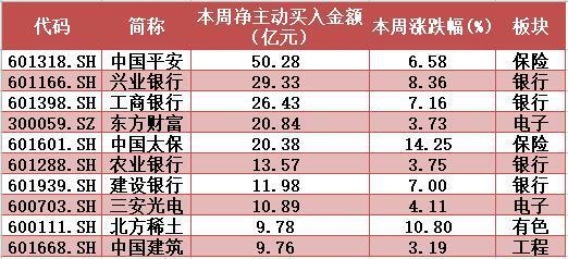 本周主力资金关注的个股中,与上周一样,金融股再度力撑大局,在净主动买入前10名中占据多达7席。其中,中国平安蝉联冠军,净主动买入高达50亿元居首,超过上周;兴业银行被净主动买入29亿元仍然居于次席。其中,中国太保周内罕见地大涨14%,迎来20亿元净主动买入。相对来讲,券商股有些缺席这波“巨象行情”,仅有东方财富被净主动买入近21亿元居第4位。