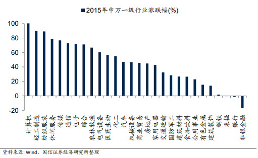 从实际表现来看,非银金融行业表现垫底,全年累计下跌17%。从风格上来看,2015年最大的特征就是小市值公司表现要远好于大市值公司,并购重组成为了市场最大的热点和炒作题材,如果按照2015年年初时的市值大小对上市公司分成十组,市值最小组别的上市公司全年收益率中位数高达127%,而市值最大的上市公司全年收益率中位数仅为7%,市值大小成为了收益率高低的决定性因素。
