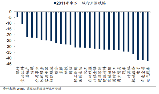 然而2011年市场呈现“普跌”特征,周期资源品行业基本上全军覆没,有色金属全年更是下跌超过40%。新兴产业也并未走出独立的行情,电子行业随着全球半导体行业周期的下行,板块大幅下跌。