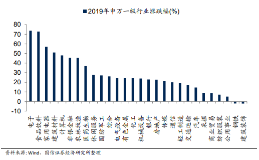 科技的确是贯穿2019年的投资主线之一。电子行业涨幅居首,全年上涨74%,计算机行业全年也上涨了48%,涨幅居前。科技股领涨市场的推动因素来自于多个方面,一是美国对华科技领域的制裁,推动我国自主可控与国产替代需求急剧增长,二是国内5G网络投资建设持续推进,经济增长的“新动能”曙光初现,三是科创板开板以来赚钱效应带动了市场情绪,提供了更高的估值空间。