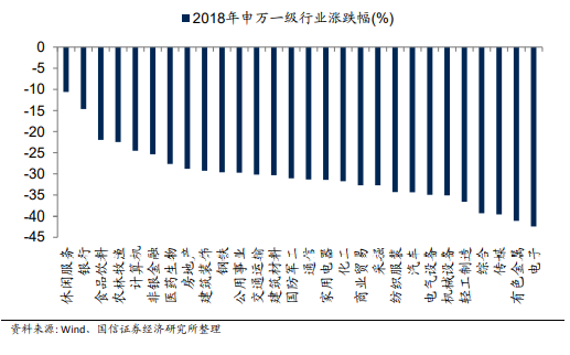整体来看,以上证50 为代表的绩优蓝筹股表现相对较优,上证综指全年的表现也要优于创业板指。从行业涨跌幅情况来看,市场投资风格集中到消费、医药、金融等现金流良好且防御属性较强的板块,休闲服务、银行及食品饮料跌幅最小。