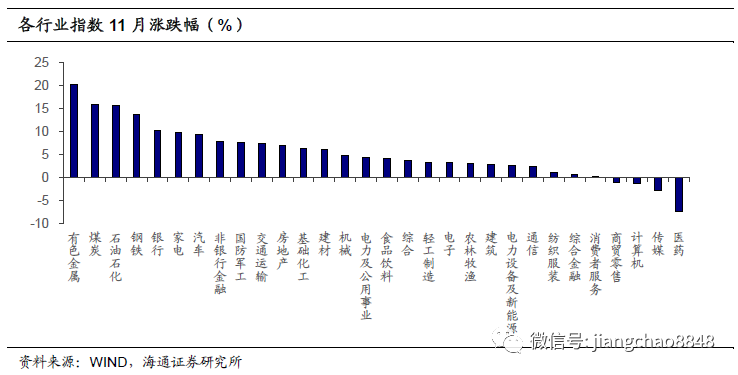 行业多数上涨。11月WIND全A指数月涨跌幅+4.33%,沪深300月涨跌幅+6.08%,创业板指月涨跌幅-1.39%,上证50月涨跌幅+6.65%。总体看上游行业例如有色、煤炭、石化等涨幅较大,低估行业例如钢铁、银行,可选消费例如家电汽车表现也较好,医药,传媒和计算机等有所回调。