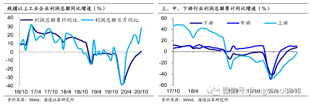上游利润增速走高。从 10 月当月增速来看,上中下游行业利润增速多数回升,其中原材料制造业利润增速明显走高,特别是化工、石油加工、钢铁等行业利润增速改善幅度较大,下游消费品类行业利润增速稳中趋缓,而中游装备制造业利润增速小幅上行。