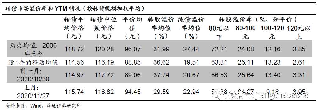 偏周期表现较好。从风格来看,中盘券涨幅较大。行业方面周期、金融和可选消费等表现较好。平均转股溢价率下降。截至11月27日全市场的转股溢价率均值29.59%,环比下降8.14个百分点;纯债溢价率均值22.94%,环比上升2.27个百分点。平价80元以下、80-100元、100-120元、120元以上转债的转股溢价率分别为57.88%、24.07%、9.18%、3.95%,环比分别变动-8.65、-1.57、-4.22、0.64个百分点。