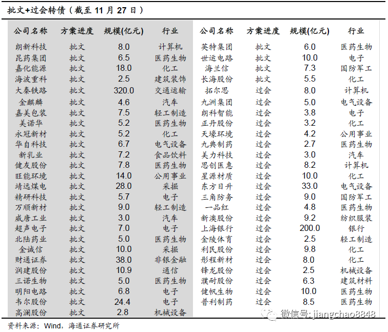 14只转债公告发行。11月洁美科技(6亿元)、盈峰环境(14.76亿元)等14只转债公告发行。审核方面,共有旺能环境(14亿元)、靖远煤电(28亿元)等18只转债获得批文,新澳股份(9.17亿元)、上海银行(200亿元)等9只转债过会,太平鸟(8亿元)、三花智控(30亿元)等8只转债获受理。此外,11月新增了闻泰科技(90亿元)、赛伍技术(7亿元)等15只转债预案。