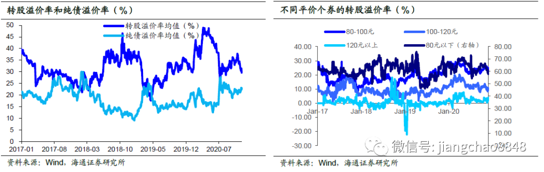 其中平价80元以下转债的转股溢价率均值57.88%,环比下降8.65个百分点;80-100元转债的转股溢价率均值24.07%,环比下降1.57个百分点;100-120元转债的转股溢价率平均值9.18%,环比下降4.22个百分点;平价120元以上转债的转股溢价率平均值3.95%,环比上升0.64个百分点。