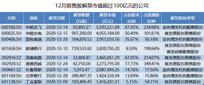 12月解禁数量超过10亿股的公司有6家,分别为华能水电(600025.SH)、邮储银行(601658.SH)、北京银行(601169.SH)、国电南瑞(600406.SH)、招商公路(001965.SZ)、工业富联(601138.SH)。