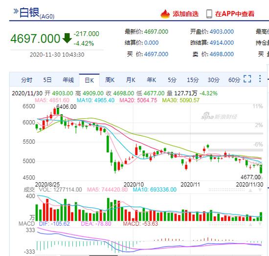 11月30日,沪银主力合约持续跳水,跌4.5%,下破4700元/千克,创7月份以来新低。