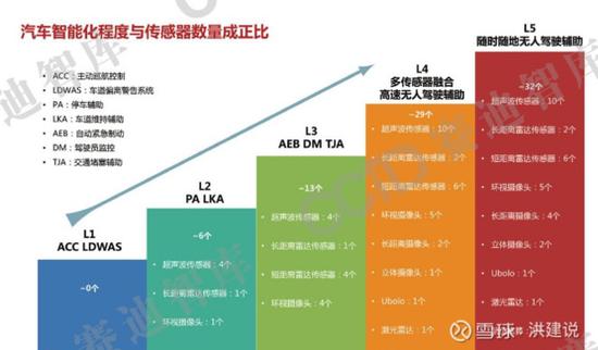智能化:与传感器数量正相关。L5级无人驾驶车辆中的传感器数量达到32个。短时间传感器市场的需求主要为摄像头和毫米波雷达,未来单一类型传感器没法担任L4及L5完完全全自动驾驶的繁杂状况与安全冗余,以激光雷达、毫米波雷达等为核心的多传感器融合成为大势所趋。