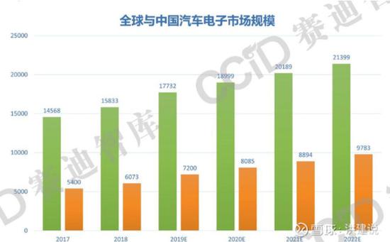 2018-2019年,全球汽车电子市场经营规模预估1.77万亿,将以6.7%的复合增速稳步增长,至2020年,全球市场容量有望突破2万亿元大关。