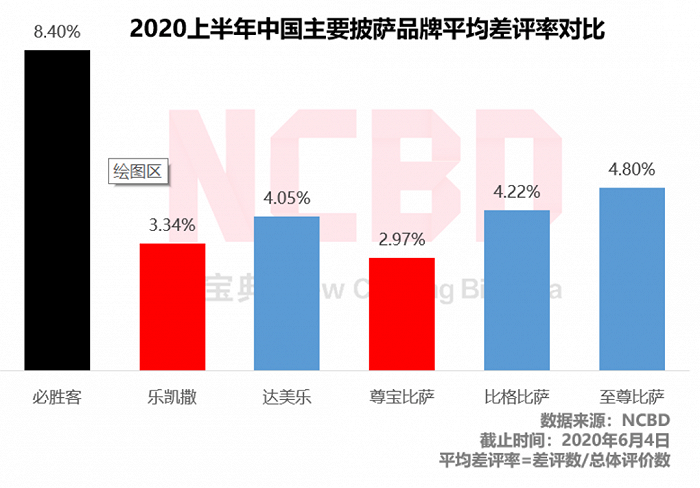 并且,哪怕是必胜客所擅长的披萨,如今也槽点满满。NCBD发布的《2020中国披萨差评大数据分析与研究报告》显示,2020年上半年,在包含必胜客在内的六个披萨品牌中,必胜客平均差评率高达8.4%,远超其他品牌,其中,第二名至尊披萨的差评率仅为4.8%。