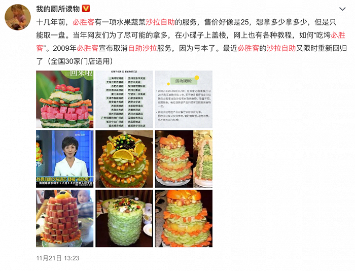然而,事与愿违,这些限时自助活动在消费者中并不如预期的那样受到好评,大多数消费者仅为尝鲜而已,甚至绝大多数人在就餐后都表示‘不会再去了’。最新推出的自助沙拉吧活动,更是反响平平——11月13日必胜客微博发布的自助沙拉吧回归动态,至今仅有14条评论、3条转发和17个赞,微博和小红书上甚至连食客种草贴都检索不出来。