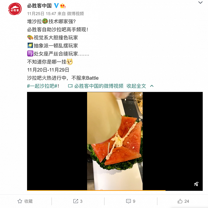 2020年11月25日,是必胜客自助沙拉吧重新推出的第十二天。必胜客的官方微博发布了一条叠沙拉的视频,这则视频也得以成为当前必胜客自助沙拉吧活动全网互动数最多的博文之一:3条转发、9条评论和24个赞。