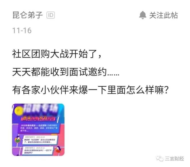 对社区团购敏感的不只是互联网巨头们,打工人们也感受到了机遇,“天天都能收到面试邀约”。