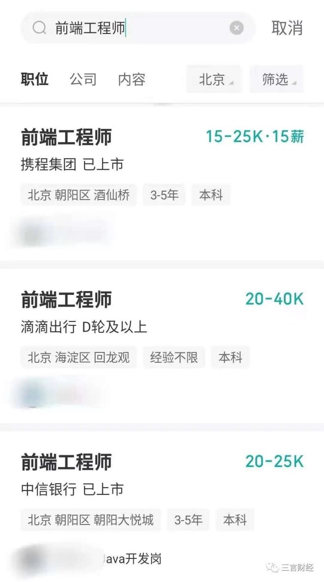 以携程、滴滴的前端工程师的薪资为对比,我们可以看到月薪最低15K,最高40K,还是一个比较大的区间。除了拼多多那个7万的职位外,携程、滴滴两个职位和美团、兴盛等几家相比上下限基本处于一个范围。