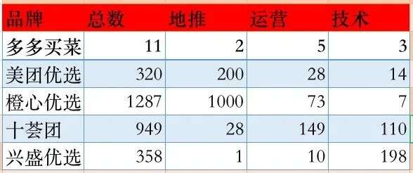 从图中能够看出,兴盛优选和十荟团这两个社区团购老玩家在技术上的人员占比较为突出。而美团优选、橙心优选这两个新玩家显然地推人员的需求更大。拼多多的多多买菜招聘较少,笔者猜测可能还有其他主体,统计上可能有疏漏。