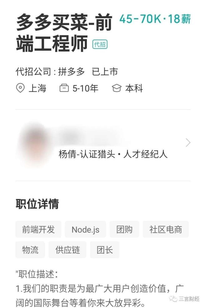 以前端工程师为例,三言财经发现各家还是有一定的差距。这里不考虑具体的工作要求,但从薪资上看,多多买菜的45K-70K一马当先,甩开其他几家很大差距。