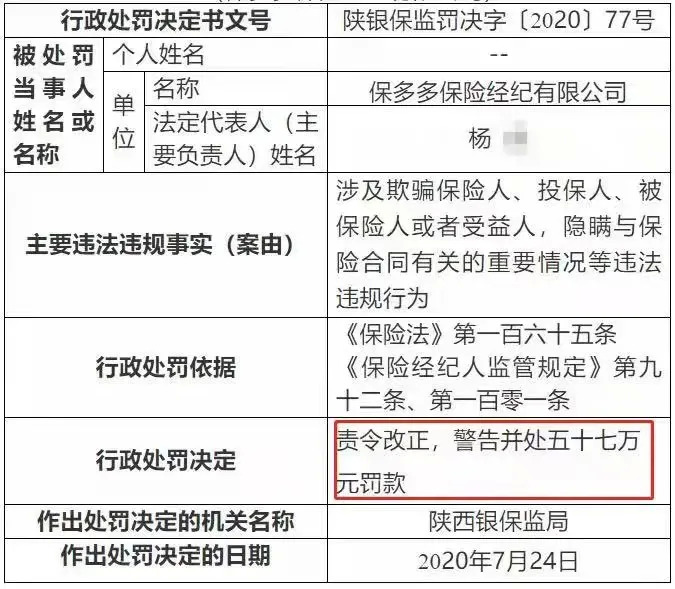 今年七月,水滴旗下保多多保险经纪有限公司因为涉及欺骗保险人、投保人、被保险人或者受益人,隐瞒与保险合同有关的重要情况等违法违规行为,陕西银保监局做出罚款76万的决定,是保险经纪公司中最大一张罚单。
