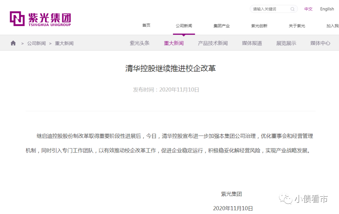 11月10日,紫光集团在官网发布消息称,清华控股将继续推进校企改革,积极稳妥化解经营风险。