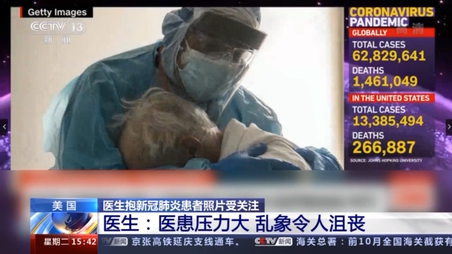 在严重的新冠肺炎疫情下,美国多地的医疗机构和人员压力巨大,而患者们的境遇同样堪忧,心理压力巨大。近日一张美国医生抱住一名哭泣的老年新冠肺炎患者的照片就受到了关注。照片上的医生日前在接受美国有线电视新闻网采访时说,医院里患者崩溃的场景经常出现,而美国人员聚集、不戴口罩等乱象仍然多发,这让本就疲惫不堪的医务人员异常沮丧。