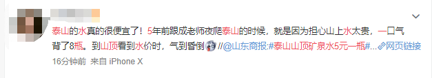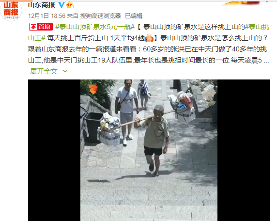 山东商报报道中强调,据当地商户介绍,泰山山顶5元的矿泉水是人力挑上山的,并将一篇报道泰山挑山工的新闻标为微博置顶。
