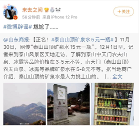 12月1日,山东商报发文《正名!泰山山顶矿泉水5元一瓶》,称记者12月1日在泰山风景区实地走访发现,泰山中天门农夫山泉、冰露等品牌价格在3-5元不等,南天门(泰山山顶)农夫山泉、冰露等品牌矿泉水在5-8元不等。
