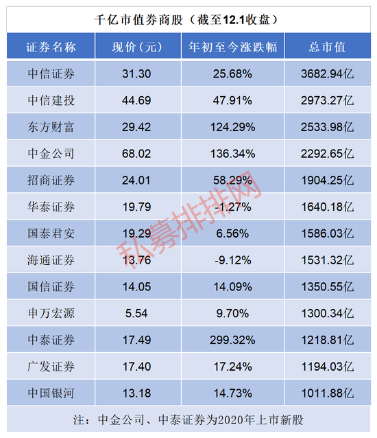 根据私募排排网统计,截至12月1日收盘,在券商指数成分股中,中信证券、中信建投、东方财富、中金公司四家券商总市值均超过2000亿元,分别为3682.94亿、2973.27亿、2533.98亿、2292.65亿。(接下页)
