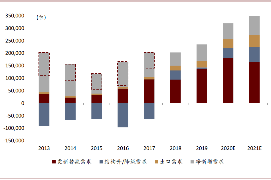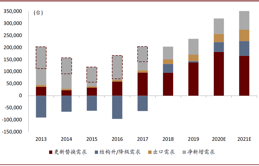 我们认为行业销量由更新替换需求、净新增需求、结构升/降级需求和出口需求构成。我们认为现阶段挖机对人工及装载机等其他机械的替代力度有望加强,出口需求有望快速增长。往前看,我们预计2021年结构升级需求和出口需求将同比增长40%-50%。