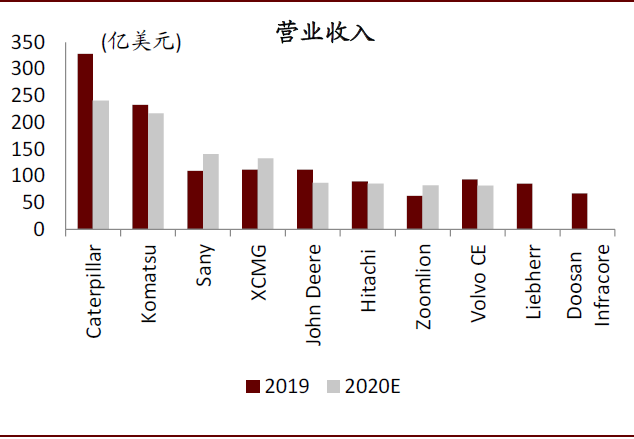 截至2020年12月1日,根据彭博一致预期,2020年卡特彼勒、约翰迪尔、沃尔沃、小松、日立收入分别同比下降26.8%/22.9%/12.9%/6.9%/4.8%。