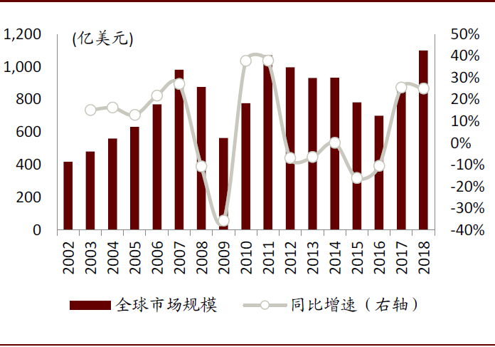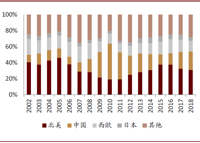 根据Off-Highway Research,2018年全球工程机械[2]市场规模1,101亿美元,同比增长25.1%。其中北美、中国、西欧、日本、其他地区(中国、日本以外的亚非拉地区)市场规模分别为340/253/147/50/311亿美元,占全球比重31%/23%/13%/5%/28%。相较于2002年,北美、西欧与日本占比下降9.8/6.1/1.0ppt,中国和亚非拉其他地区占比上升13.6/3.3ppt。