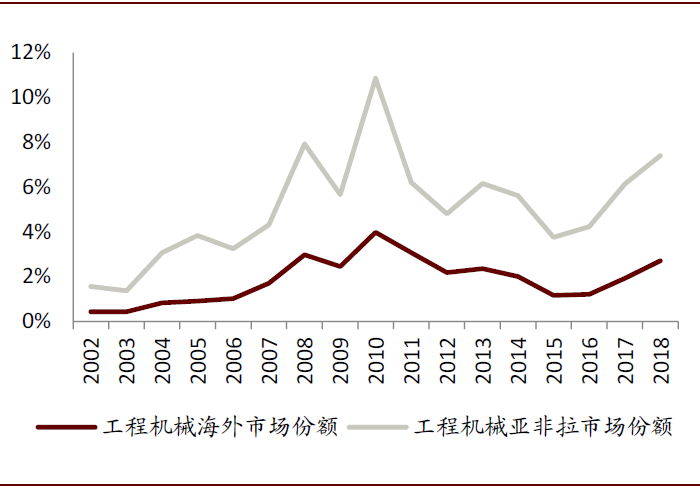 图表:2018年我国工程机械在亚非拉市场份额约7.4%