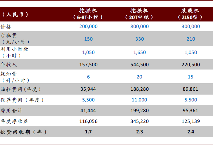 图表:挖掘机及装载机投资回报期测算(2019年)