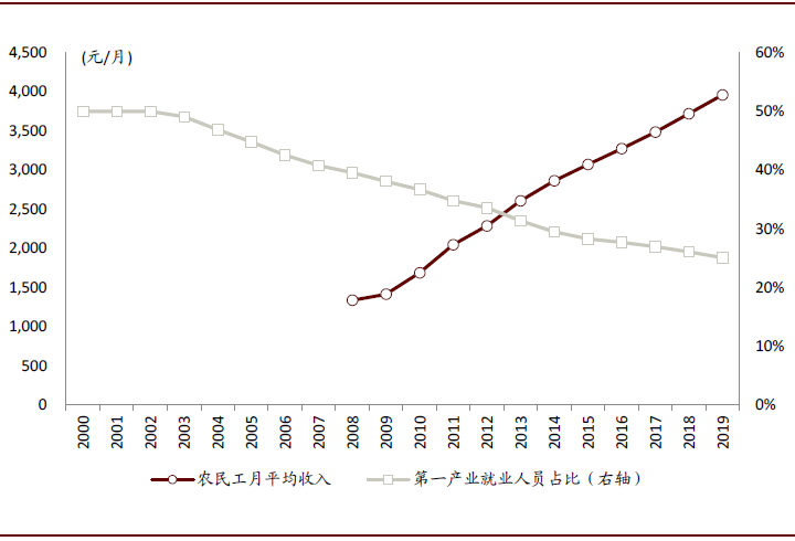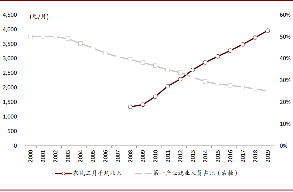 人口外流使得我国农村劳动力短缺问题加剧,2008-2019年第一产业就业人口从2.99亿人持续下降至1.94亿人,占总就业人口比重从2008年的36.7%下降至2019年的25.1%。另一方面,农村劳动力成本持续上升,农民工人均月收入从2008年的1,340元累计上升196%至2019年的3,962元,而根据我们的终端调研,这十年间国产小型挖掘机价格至少下降20%,性价比大幅提高,有望加速替代人工。