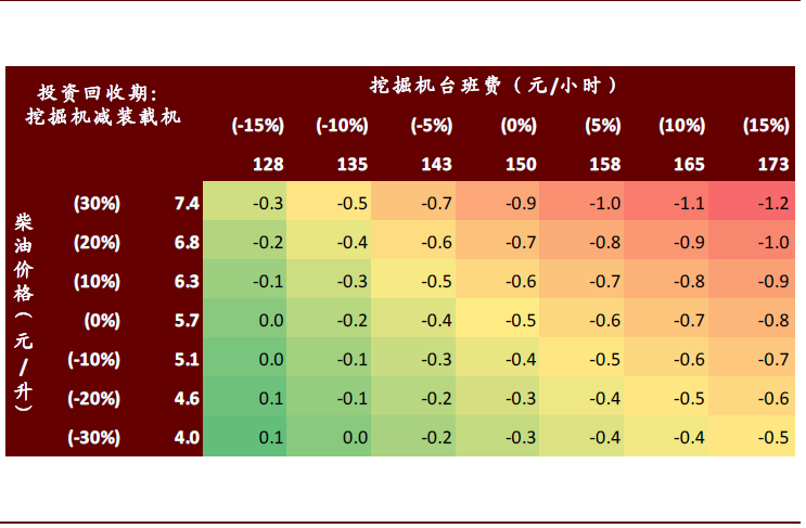 图表:挖掘机与装载机投资回报期差值的敏感性分析