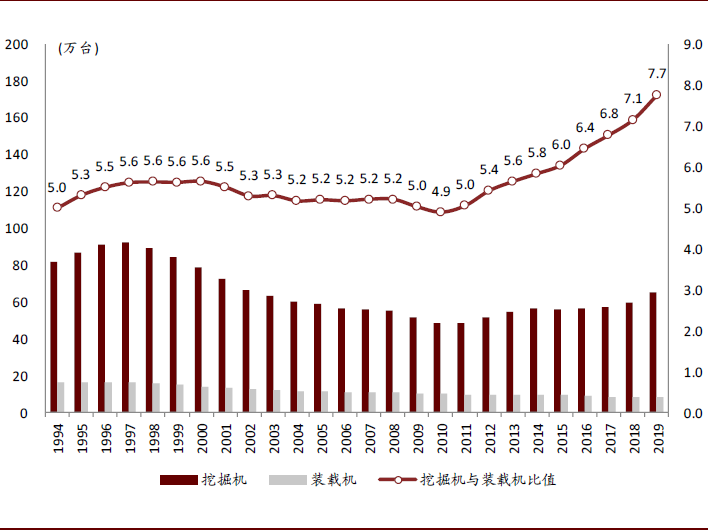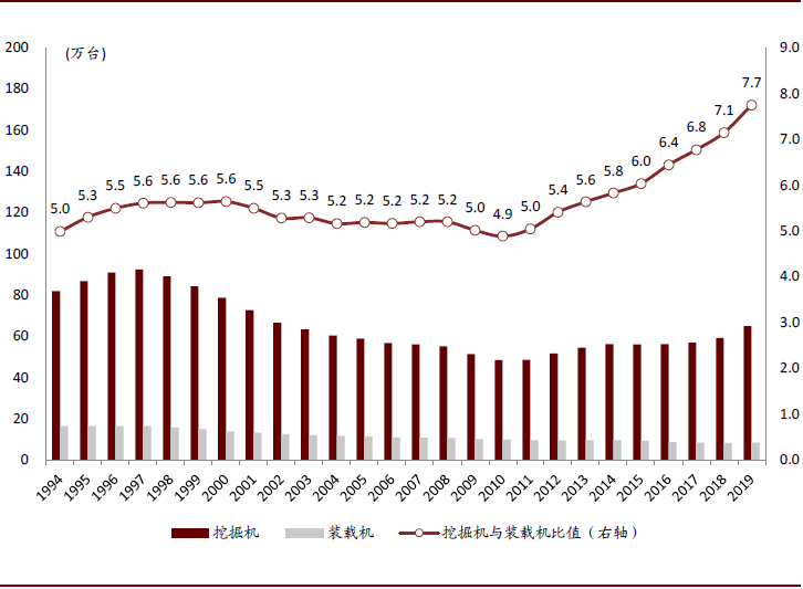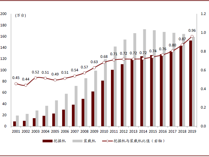 图表:中国挖掘机及装载机保有量比值提升至1:1
