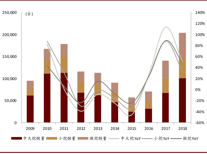 分类定义:由于中日数据口径不同,我们对中国按整机质量分类,6吨以下为微挖,6-13吨为小挖,13吨以上为中大挖;日本按斗容量分类,0.2立方米(对应约5吨)以下为微挖,0.2-0.6立方米(对应约15吨)为小挖,0.6立方米以上为中大挖。