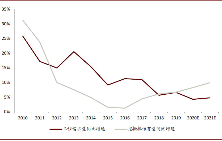 工程需求量是挖掘机保有量增长的重要驱动因素。按照下游划分,房地产、基础设施建设、矿山开采、农田水利等是挖掘机主要应用场景,其中地产和基建占据主导地位。从历史趋势来看,我国挖掘机保有量同比增速基本与下游工程需求同比增速相对应。我们预计2021年我国工程量需求同比增速约5%。