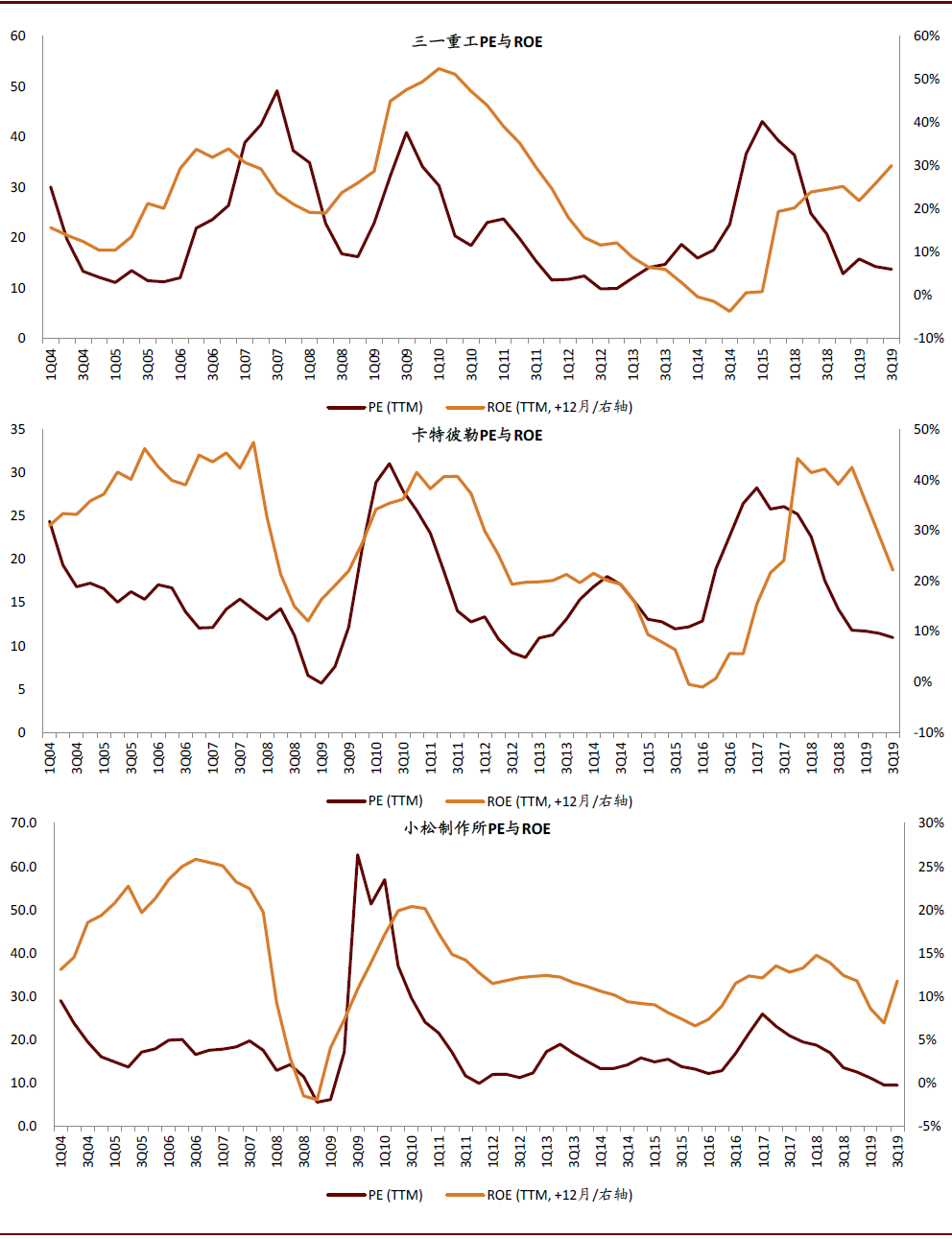 2004年以来,三一重工、卡特彼勒、小松的滚动PE变动趋势与前向ROE基本一致。