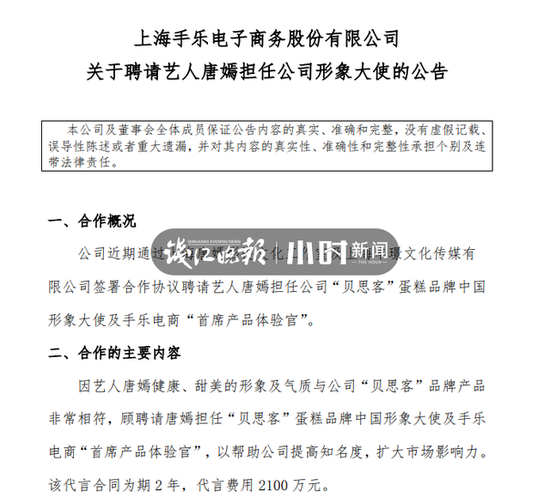 2017年,手乐电商与唐嫣签订协议,代言合同为期2年,代言费用2100万元。