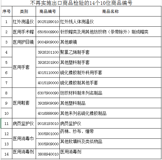 根据《中华人民共和国进出口商品检验法》及其实施条例,自本公告发布之日起,对“9025199010”等14个10位商品编号项下的医疗物资(详见附件)不再实施出口商品检验。其中商品编号3005901000和3005909000项下属于危险货物的、商品编号3808940010项下属于危险化学品的,仍按出口危险货物或出口危险化学品检验监管要求执行。