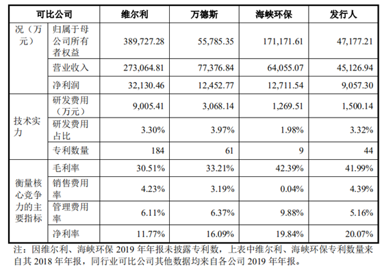 与可比公司相比,天源环保44项专利数量与维尔利(300190.SZ)、万德斯(688178.SH)仍有较大差距,后两者分别为184项、61项;研发费用方面也有着数倍差距。不过,天源环保(603817.SH)的专利数也远超海峡环保的9项。