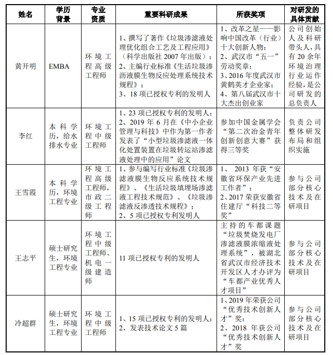 2017至2019年,天源环保研发费用逐步上升,分别达891.71万元、1102.25万元和1500.14万元。截至 2020年6月30日,公司共有研发人员34人,其中核心技术人员共5人,分别为黄开明、李红、王雪霞、王志平、冷超群。其中,黄开明是公司创始人及科研带头人,李红则是2017年引进公司的,冷超群则是2018年引进公司的。