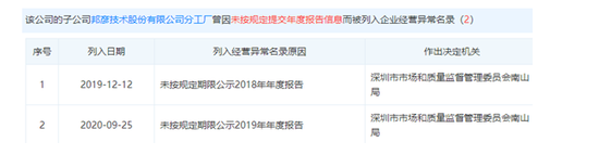 另外,天眼查显示,邦彦技术子公司邦彦技术股份有限公司分工厂在2019年12月和2020年9月因未按规定期限公示年报而被列为经营异常。无独有偶,邦彦技术子公司邦彦技术股份有限公司北京分公司也有类似的情况,该公司列入经营异常名录的时间为2020年10月。