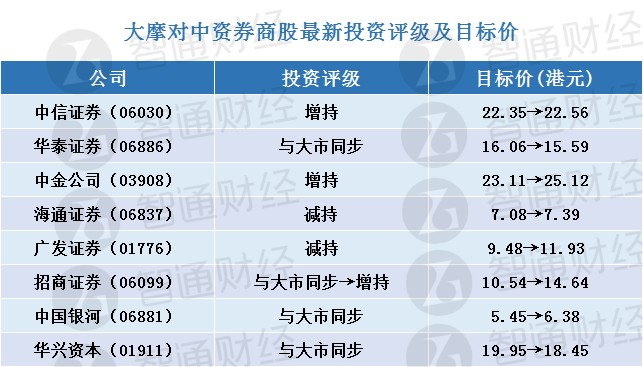 大摩看好招商证券(06099),相信通过与互联网公司合作,市场份额有潜在提升空间,而且与招行(03968)有协同作用,将招商证券评级上调至“增持”,目标价升至14.64港元,并将招商证券、东方财富、中金公司(03908)及中信证券(06030)列为行业首选。