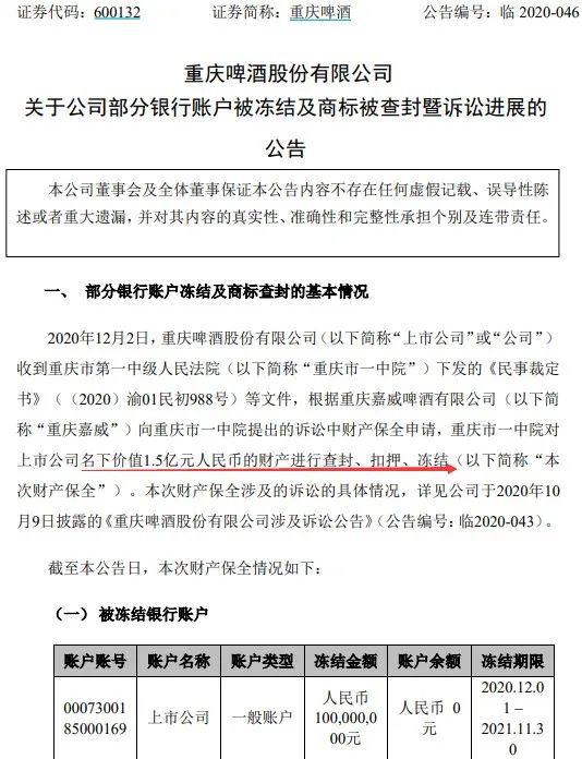 重庆啤酒涨停,最新股价116.51元,A股市值564亿元。不过就在昨日晚间,重庆啤酒公告表示,被冻结财产涉及银行账户1亿元,冻结期限为2020年12月1日至2021年11月30日;被查封商标包含10项“山城”系列商标和16项“重庆”系列商标。重庆啤酒方面称,本次被冻结的银行账户仅为公司的一般账户之一,本次商标被查封不影响公司继续使用该等商标或对外授权使用,也不影响公司订单的正常执行。