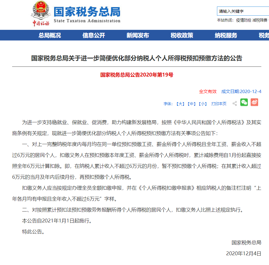 12月4日,国家税务总局发布《关于进一步简便优化部分纳税人个人所得税预扣预缴方法的公告》。